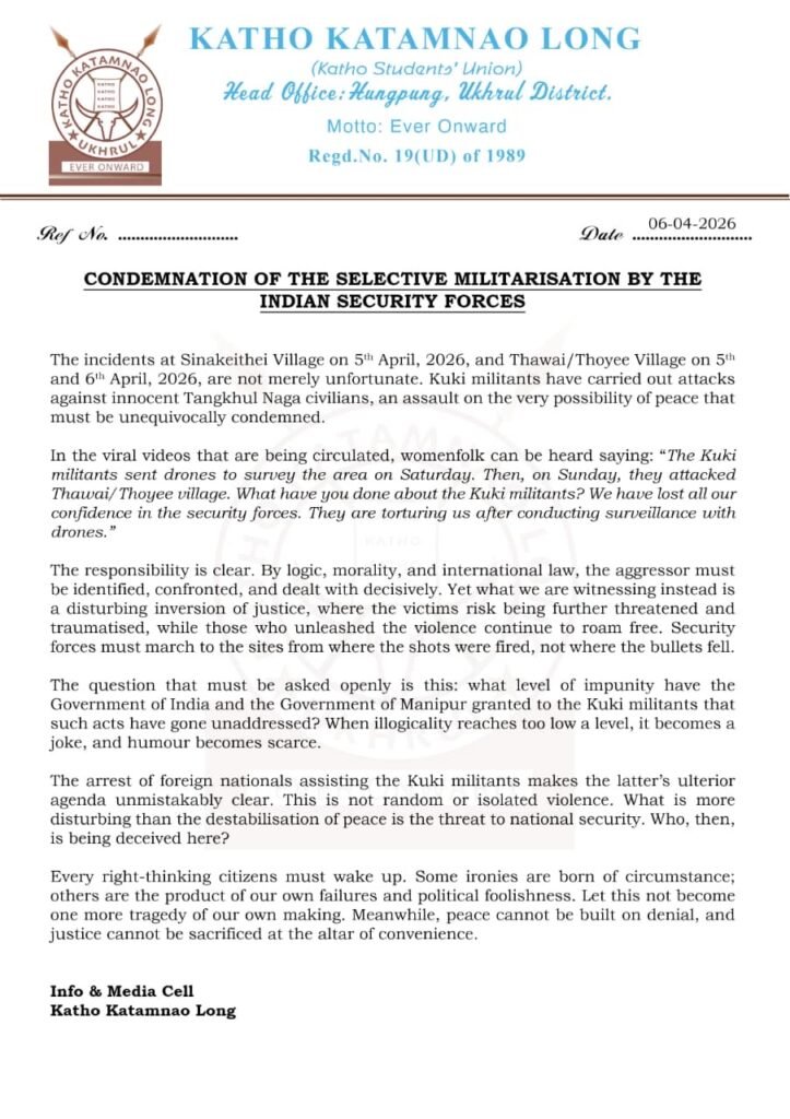 The statement, released by Katho Katamnao Long (Katho Students’ Union), refers to reported attacks on April 5 in Sinakeithei village and on April 5–6 in Thawai/Thoyee village. According to the organisation, the attacks were allegedly carried out by Kuki militants and targeted Tangkhul Naga civilians, raising concerns over escalating tensions and threats to peace in the region.