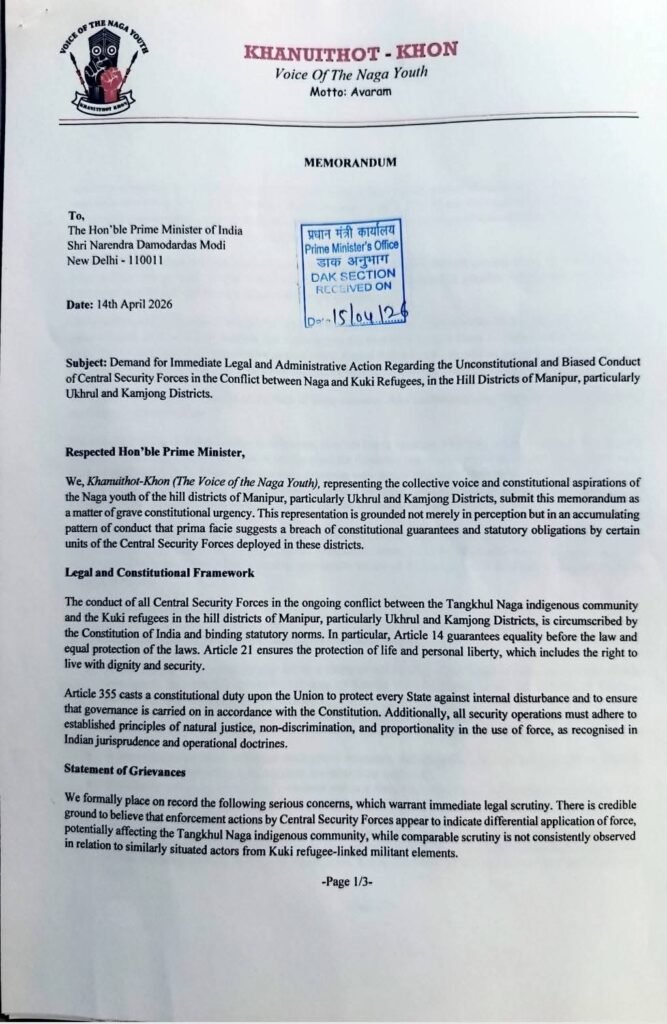 Khanuithot-Khon (Voice of the Naga Youth), a youth body from Manipur’s Ukhrul district, has submitted a memorandum to Prime Minister Narendra Modi alleging unconstitutional and biased conduct by Central Security Forces in the hill districts of Ukhrul and Kamjong. The memorandum, dated April 14, 2026, seeks immediate legal and administrative intervention over what it describes as serious lapses in security operations.