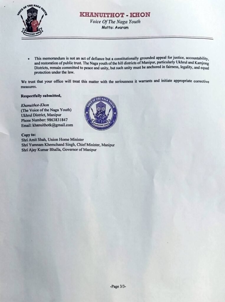 In its closing, the organisation said the appeal was not an act of defiance but a call for justice, accountability, and restoration of public trust. Copies of the memorandum were also marked to Union Home Minister Amit Shah, Manipur Chief Minister Yumnam Khemchand Singh, and Governor Ajay Kumar Bhalla.