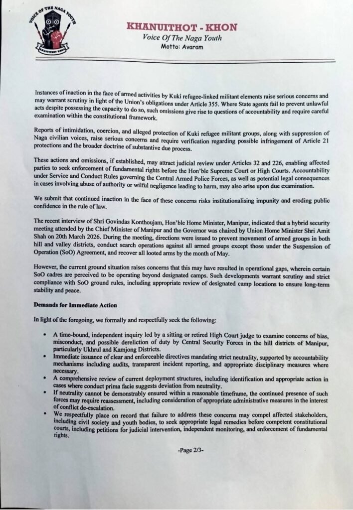 Khanuithot-Khon has demanded a time-bound, independent inquiry led by a sitting or retired High Court judge into allegations of bias, misconduct, and possible dereliction of duty by central forces in the two districts. It also called for clear directives on neutrality, stronger accountability mechanisms, and a review of current deployment structures.