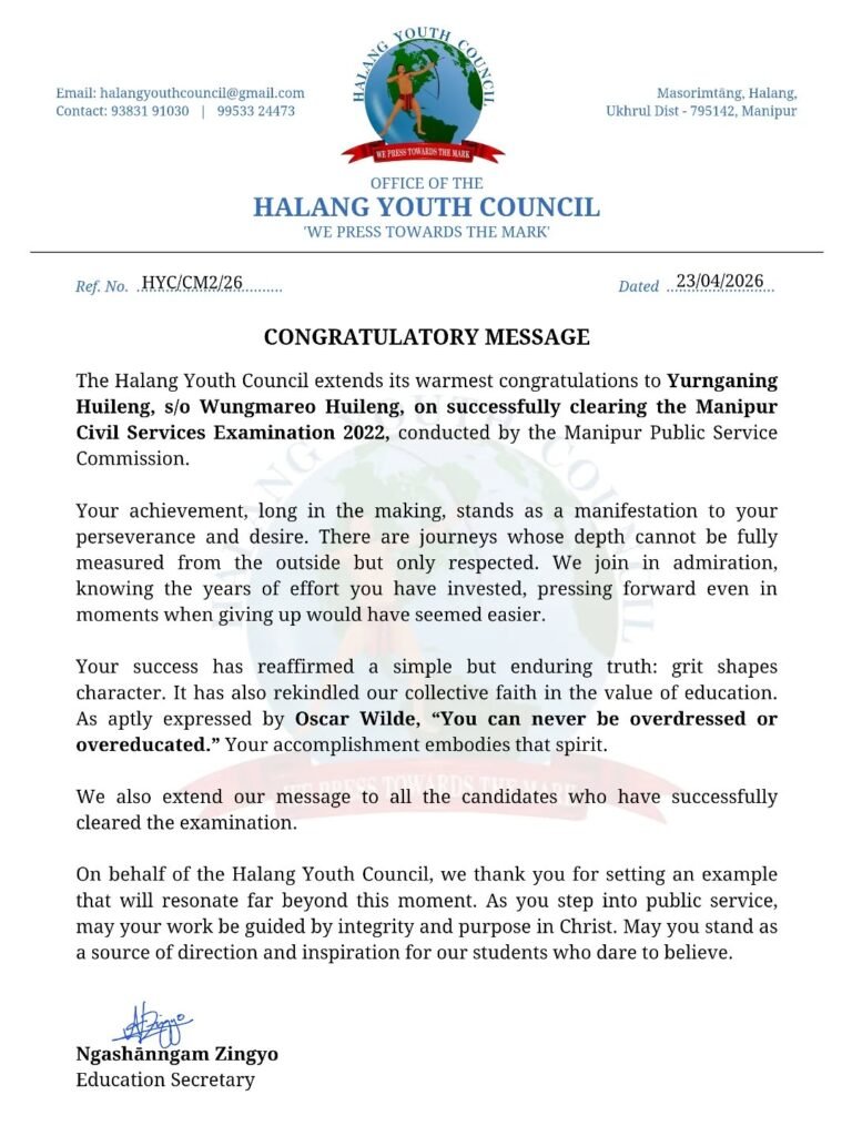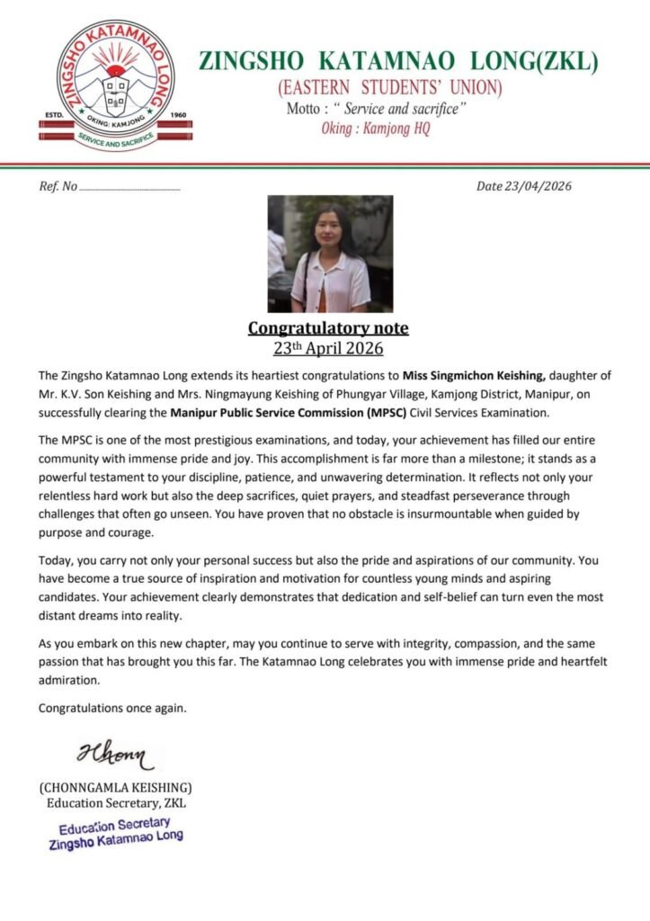 Similarly, the Zingsho Katamnao Long (Eastern Students’ Union) congratulated Miss Singmichon Keishing, recognizing her success as a reflection of discipline, patience, and commitment. The union emphasized that her achievement brings pride not only to her family but also to the wider community.