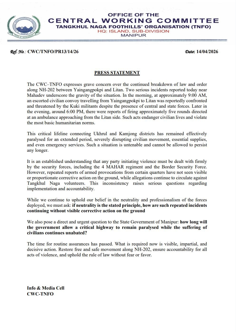 The Central Working Committee of the Tangkhul Naga Foothills’ Organisation (CWC-TNFO) has expressed grave concern over the continuing breakdown of law and order along National Highway-202, particularly between Yaingangpokpi and Litan.