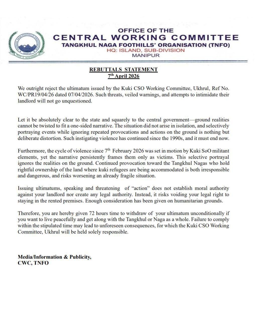 TNFO Rebuts Kuki CSO Statement on BSF Personnel’s Death, Calls for Impartial Probe